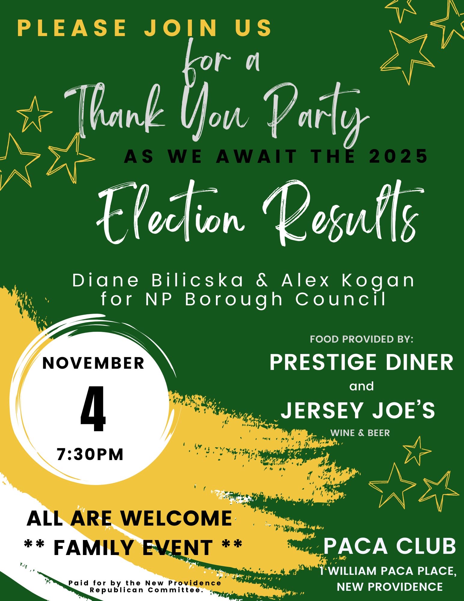 Nov 4 NPRC November Election Party 7:30 pm - 10:00 pm The William Paca Club 1 William Paca Place, New Providence Event Details Get Directions