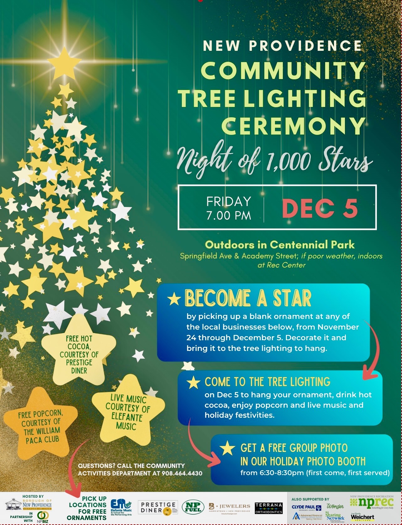 Dec 5 NP Holiday Tree Lighting Event 7:00 pm - 9:00 pm Borough of New Providence 360 Elkwood Avenue, New Providence Event Details Get Directions